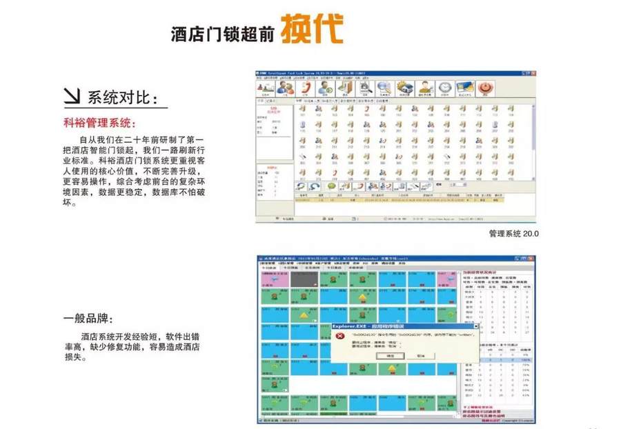 酒店锁【免维护系统】四大优势 一、【强大的出错拦截】:有效防止由客户错误操作导致系统崩溃; 二、【防因电脑断电或死机导致崩溃】:确保不出现因电脑断电或死机导致的系统崩溃现象; 三、【数据库自动备份】:确保系统意外瘫痪后可快速恢复正常,更进一步提高系统的数据安全; 四、【提供数据接口与国内外酒店管理软件无缝连接】:科裕酒店锁管理软件已与国内外大多数酒店管理软件成功对接,并获著名的microsFIDELIO/Operai(德国酒店管理软件)的对接许可,不会产生因对接问题进行的软件维护工作。 专注27年,第一把酒店锁诞生 从研发出第一把酒店锁,科裕便结合市场痛点不断前行创新!从产品质量与标准,科裕无论从材料硬度、韧度、密度等物理性能或处理工艺都有明显优势,不容小觑的内外设计,电路抗干扰、防纠错设计、人性化设计,电路式全密封设计处理。 论品牌影响力,专注电子锁领域有二十多年的历史,企业资金、技术研发、制造能力是行业内有实力的企业,其快速响应和优质的本土化服务是其它品牌商难以企及的。
